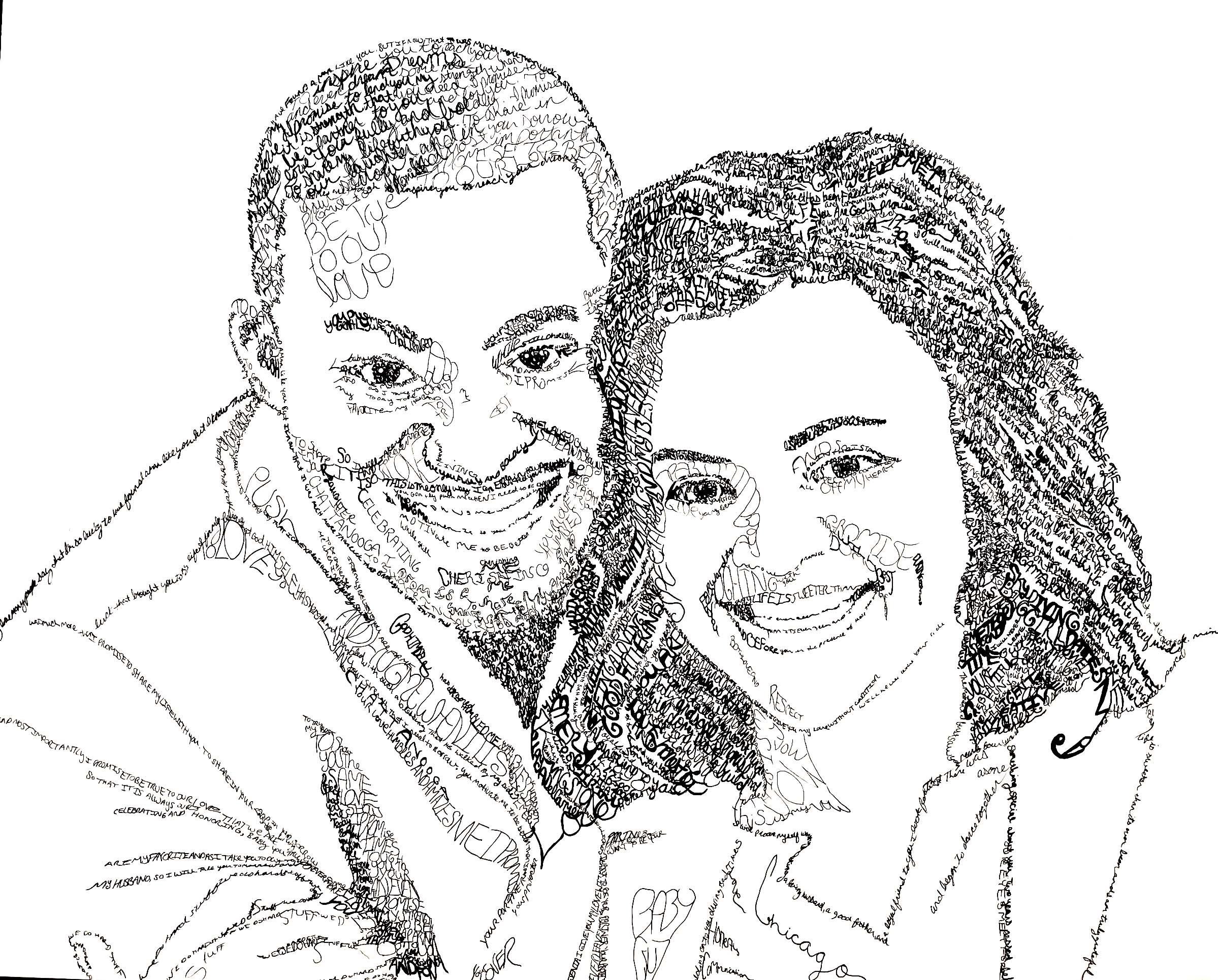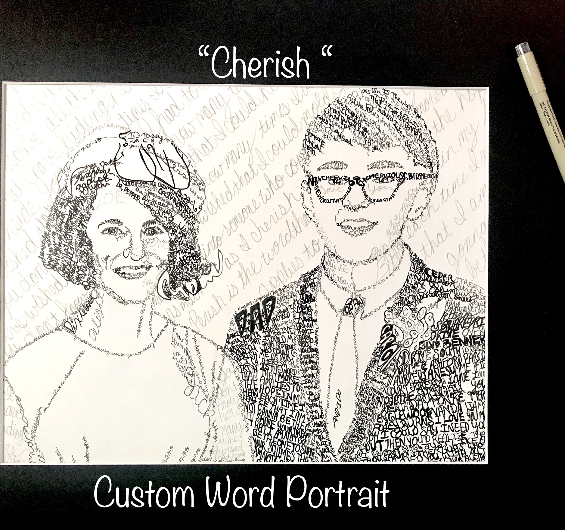 We are all woven from a myriad of attributes, experiences, people, emotions, and thoughts. I hand-write with ink to compile a likeness using a list of words, lyrics, verses, etc. that describe the subject.